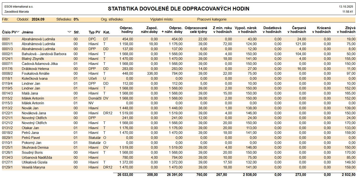V Datovém zdroji sestavy byly vyloučeny typy PV 99 a 10 (externisté), jsou zde skutečné nároky a zůstatky dovolené v období.