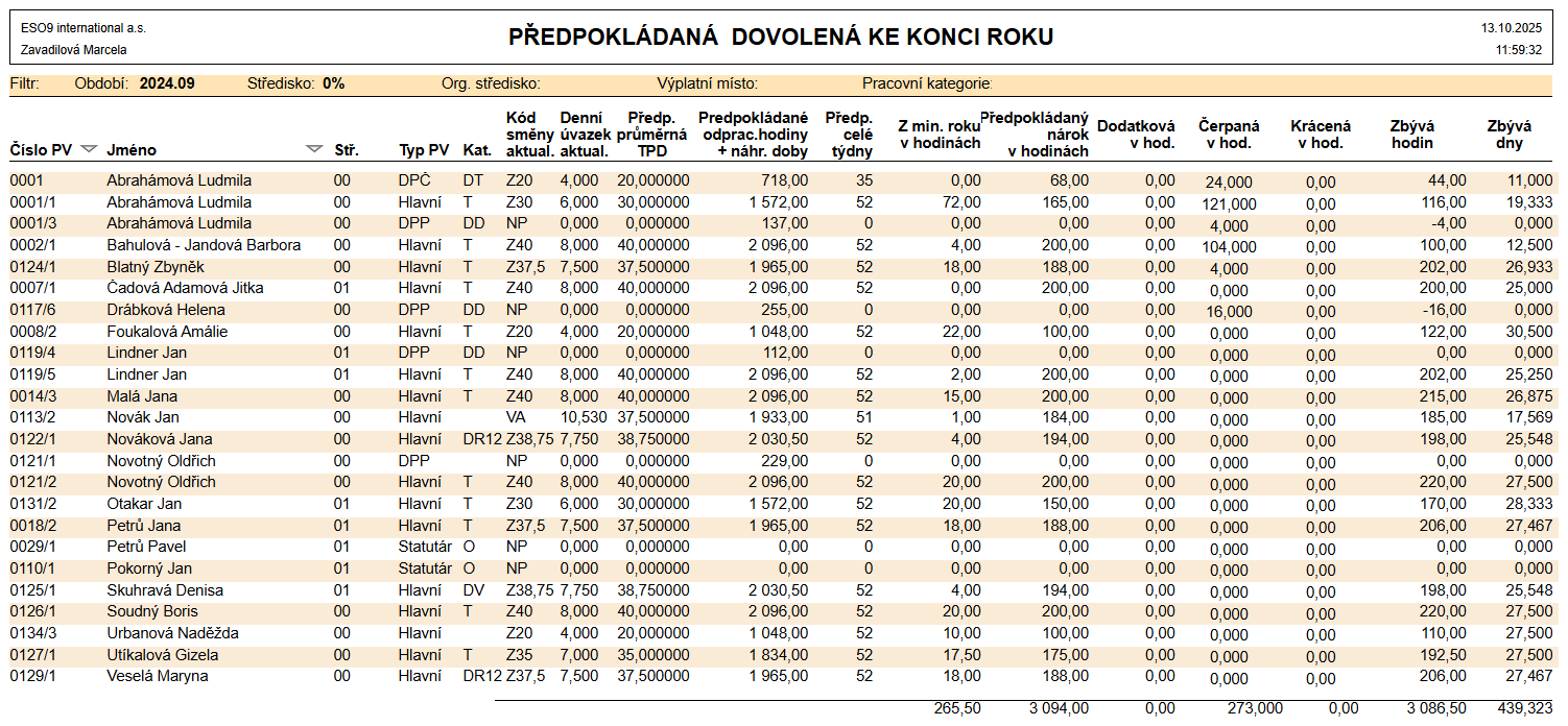 - předpokládaný nárok v hodinách - vypočteno na základě předpokládaných odpracovaných hodin a předpokládané průměrné TPD. Počet hodin v tomto sloupci navyšuje trvalá MS D009 Dovolená - úprava ročního nároku v týdnech.