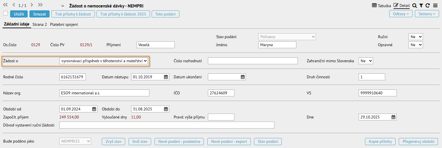 Po vygenerování přílohy nad složkou 513P Vyrovnávací příspěvek se na vygenerované příloze v položce Žádost o doplní vyrovnávací příspěvek v těhotenství a mateřství.