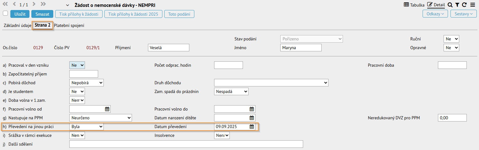 Zároveň se na záložce Strana 2 v položce h) Převedení na jinou práci doplní Byla. Do položky Datum převedení se naplní datum od ze složky 513P Vyrovnávací příspěvek. Datum převedení je možné v případě potřeby ručně změnit podle skutečného data převedení na jinou práci.