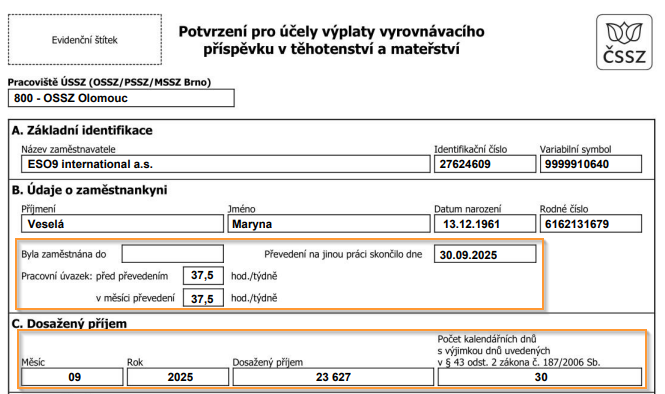 Na formulář Potvrzení pro účely výplaty vyrovnávacího příspěvku v těhotenství a mateřství vstupují tyto údaje