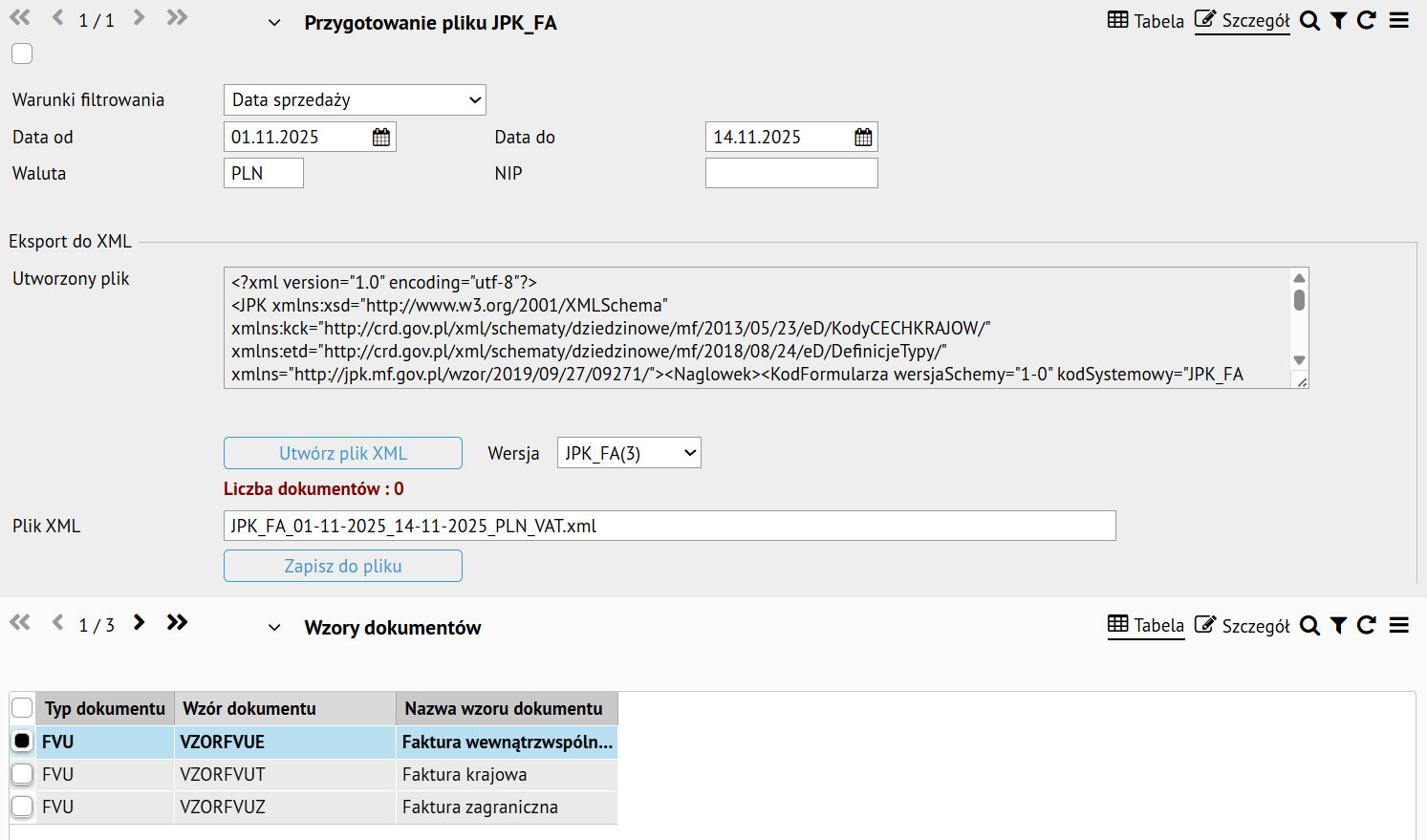 W górnej części strony wprowadza się warunki filtrowania dla pliku JPK, w dolnej części strony wybiera się wzory dokumentów dla pliku JPK.