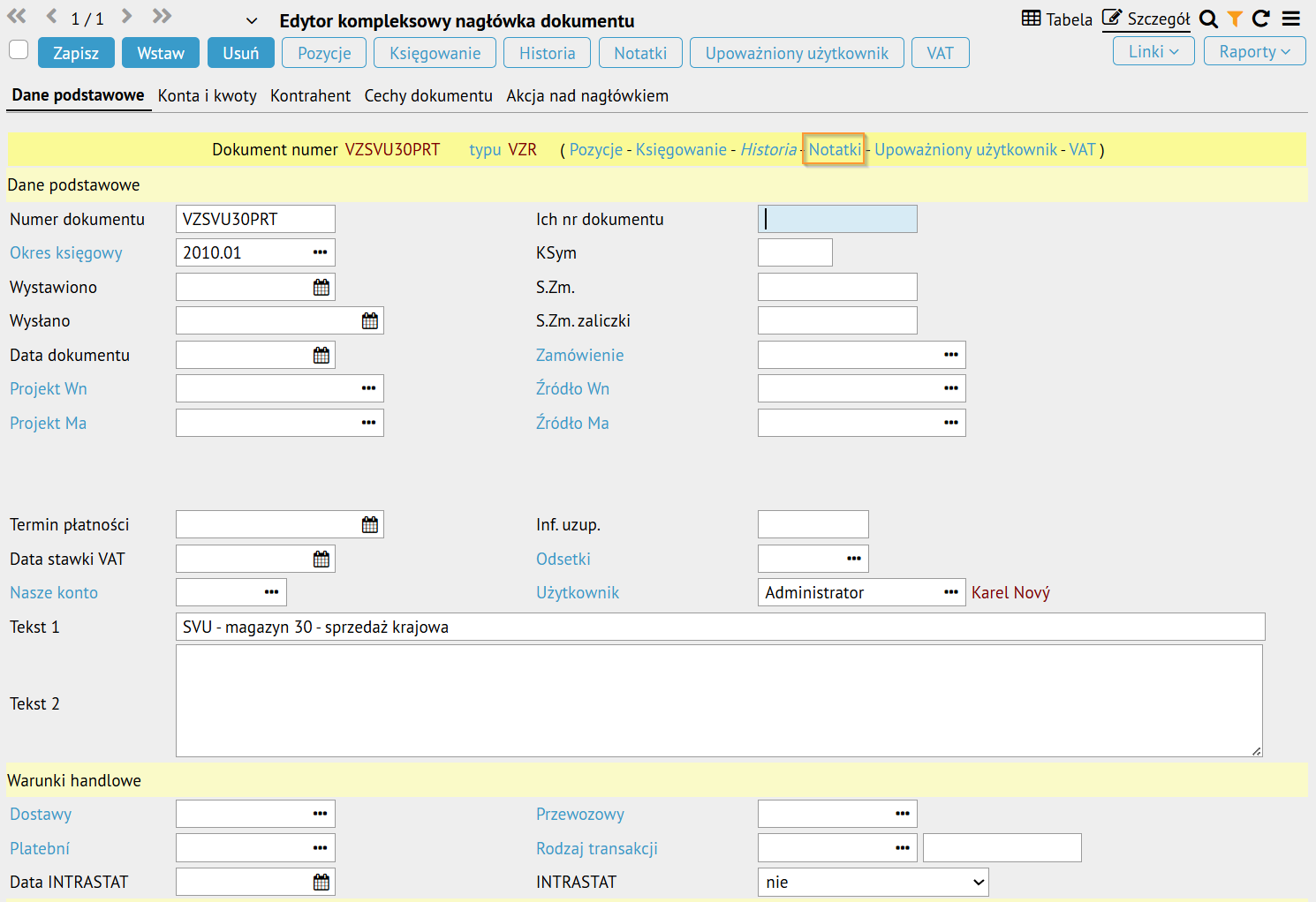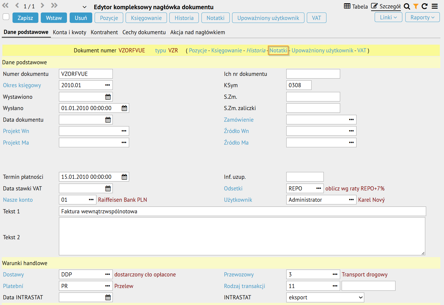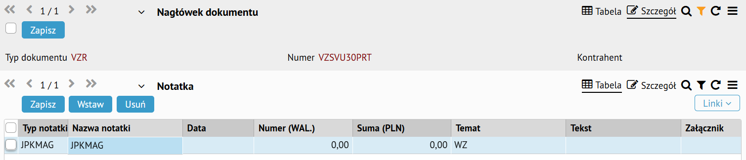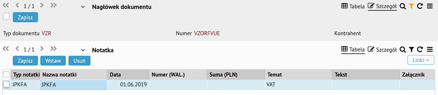Wzory dla plików JPK można dodać, dołączając do wybranego wzoru notatkę typu JPKFA. Można to ustawić w kompleksowym edytorze (czynność 9.9.1 Kompleksowy edytor dokumentu).