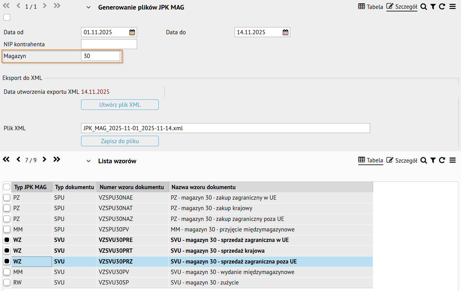 W górnej części strony wprowadza się warunki filtrowania dla pliku JPK, w dolnej części strony wybiera się wzory dokumentów dla pliku JPK. Wzory widoczne są dopiero po wpisaniu kodu magazynu.